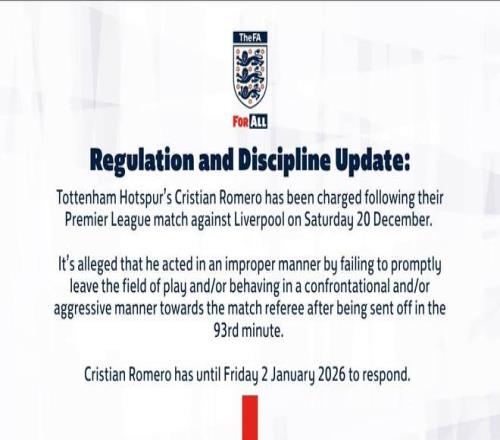 热刺球员克里斯蒂安-罗梅罗在12月20日与利物浦的英超比赛后被指控,据称,他在第93分钟被罚下场后,没有及时离开比赛场地和/或以对抗性和/或攻击性的方式对待比赛裁判。克里斯蒂安-罗梅罗需要在2026年1月2日之前作出回应。
