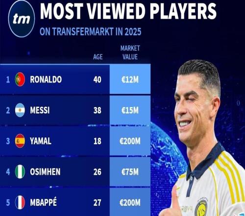 德转2025年度球员浏览量排名:C罗第1,梅西第2,亚马尔第3 -